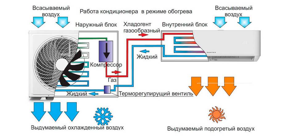 В сплит-системах с функцией обогрева используется обратный цикл: